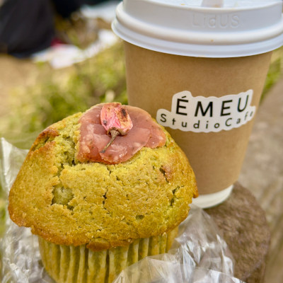 Let's have a little cafe time!! Sakura Muffin and a cup of coffee under the cherry bloom. ♥♥♥